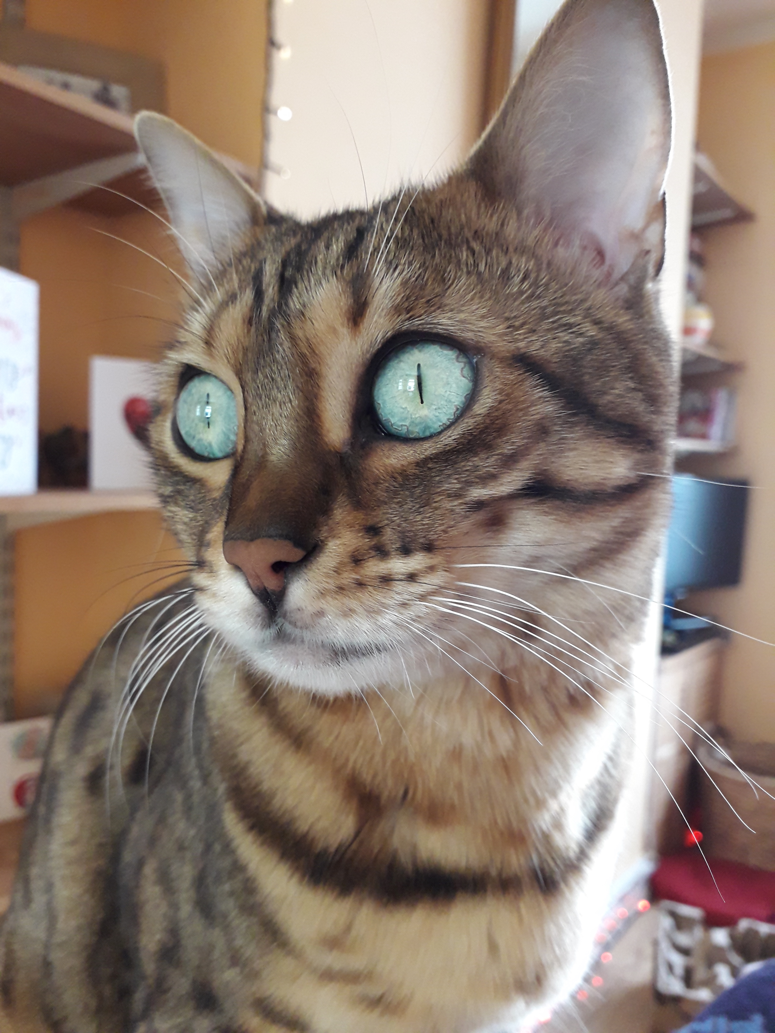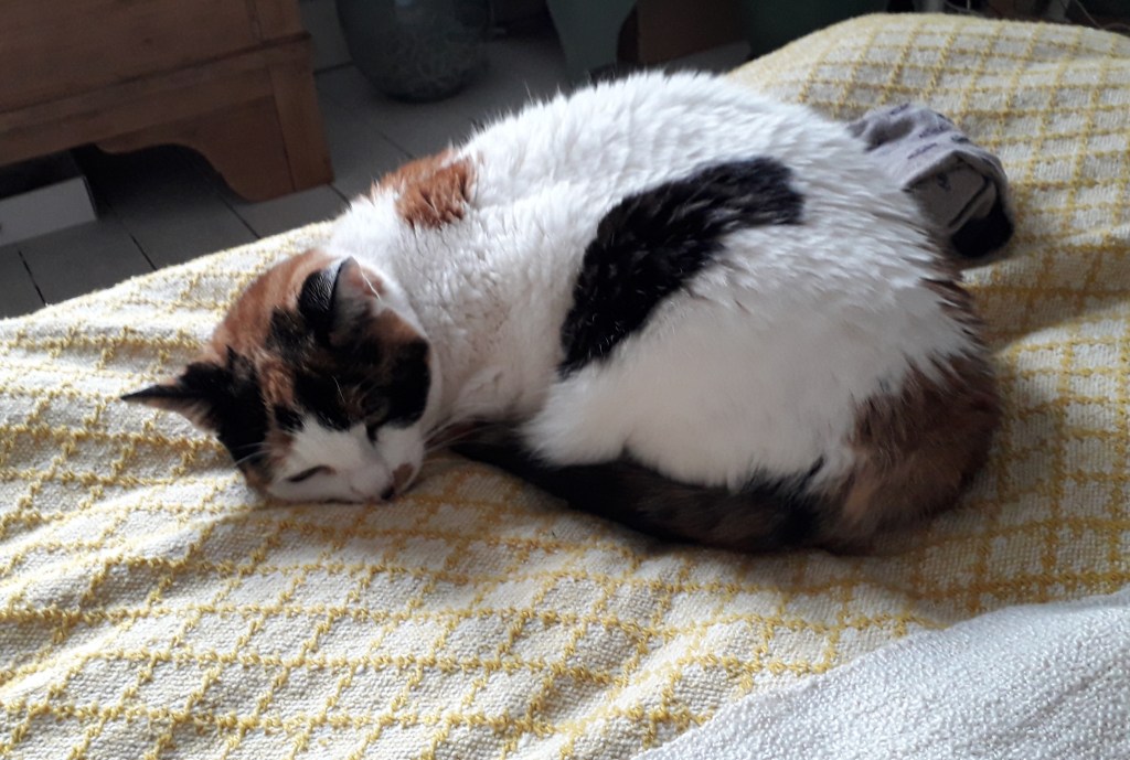 I thought it would be fun to post me and Sefi chatting after I’ve been away a few days. Don’t tell Sefi but I’ve been up the road cat sitting her cousin: my sister and wife’s beautiful calico angel. (pic below). Anyway, my Otter app has transcribed my voice, but not Sefi’s! Still, I think it’s pretty obvious what she’s saying. Listen below: