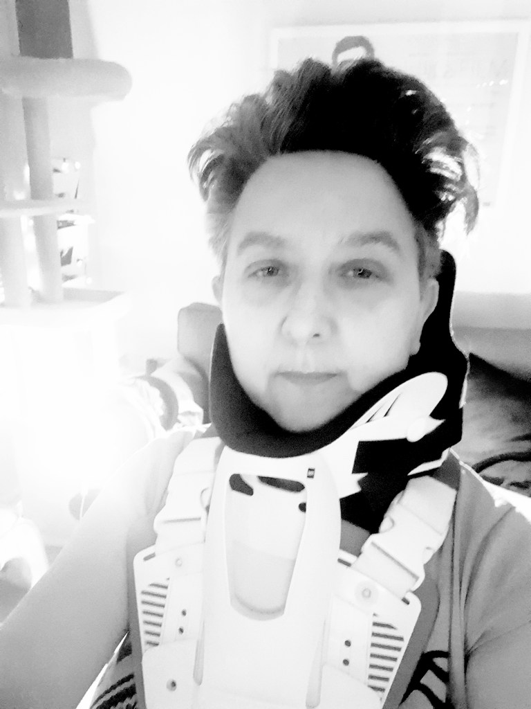 It started last Spring when I fell out of our attic. Was in a back brace for months. I’ve included a pic. It’s blurry and I’ve got bed-hair and dark circles but I quite like it. Sort of sci-fi. And the light shining up at me from behind seems, I dunno, meaningful somehow.